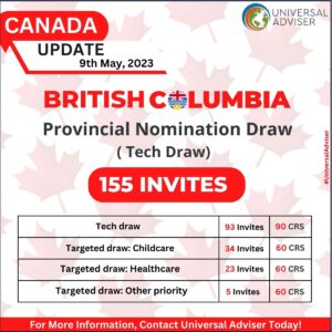 BC PNP Draw The British Columbia Provincial Nominee Program draw results were announced on May 9th. A total of 155 Invitations to Apply for the Canada PR were issued in this round. Out of the 155 ITAs issued, 93 were awarded to qualified candidates in the targeted Tech category for...