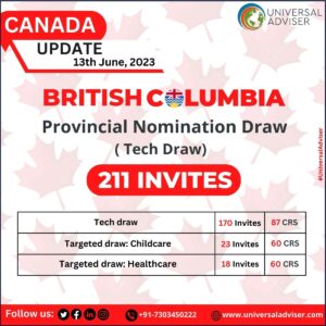 British Columbia Latest Skills Immigration Draw The province of British Columbia announced its new Skills Immigration draw, where a total of 211 Invitations to Apply for permanent residency were issued to many categories of the British Columbia Provincial Nominee Program (BC PNP). This draw took place on 13th June 2023....