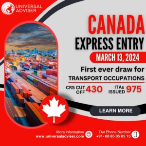 Back-to-Back Express Entry Draws Issued: 975 ITAs Issued to Transportation Occupations IRCC announced an Express Entry draw on 13th March 2024. This draw was under the Transport Occupations (2024-1) category where a total of 975 ITAs were issued to the eligible candidates.The CRS cutoff score for this draw was 430....